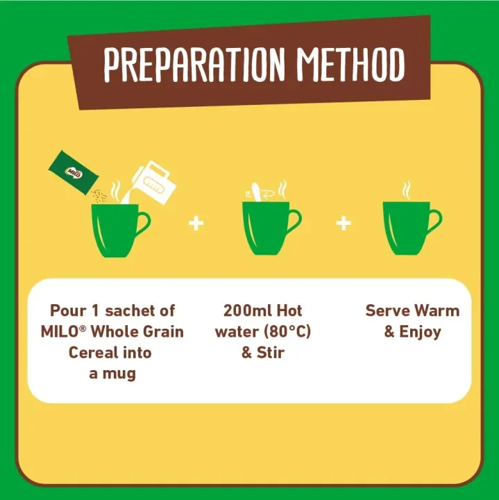 Each cup of MILO® has the natural goodness of malt barley, milk, cocoa, 6 vitamins and 3 minerals, plus only ~1 teaspoon of added sugar (sucrose). All these nutritious goodness gives you energy to take on the day!